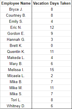 Microsoft Excel gives you an easy option. In whichever workbook you want to use to keep track of this data, create a list of your employees’ names and the number of vacation days each has taken.