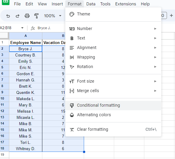 Highlighting the names and their number of days taken, select Format from the menu and click into Conditional formatting.