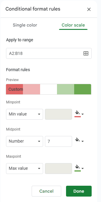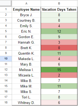 You’ll then see your selected range defined in the Apply to range box, with Format rules available for you to fill out. Under Minpoint, make sure Min value is selected, and select the color that will best communicate to you what this means. For this example, we’re trying to determine which employees have used the least number of their available days, so we’ll go with red, as it’s a bit of a red flag. Under Maxpoint, do the same, but select Max value and select a different color. Since these employees are the ones who are using enough of their vacation days, we’ll use green.